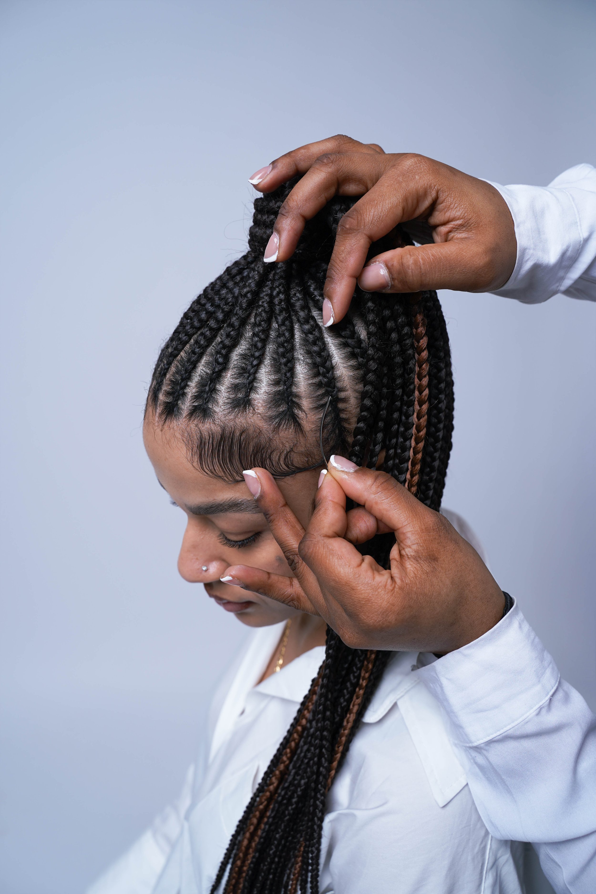 Please arrive with your hair washed, blow-dried, and free of all products. This includes no leave-in conditioner, oils, grease, creams, serums, or butters, as product buildup interferes with parting, grip, and braiding gel.